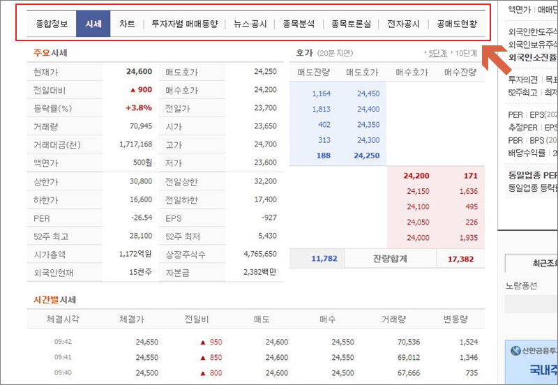 ▼ 이 외에도 시세에 관련된 다양한 지표, 종목 분석 자료, 뉴스와 공시 자료, 사람들의 토론 내용, 전자공시 내용 등을 알아볼 수 있습니다. 이 정도만 알아도 종목별 오늘 주가 현황에 대해 빠삭하게 알 수 있습니다.