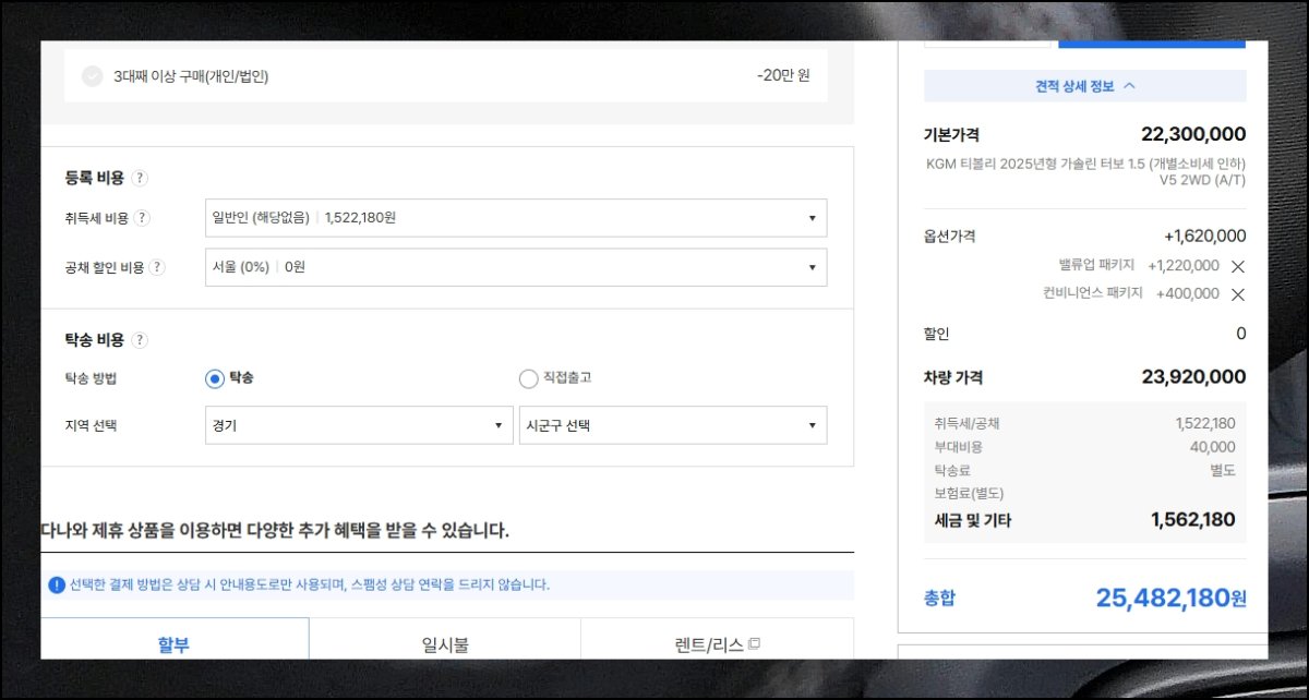 페이지 우상단에 자리한 쌍용자동차 종합 신차가격표에서 전체 구매 지출액을 조회 가능해요. 지정한 모든 사양과 조건이 합산된 확정 금액이 표출됩니다.