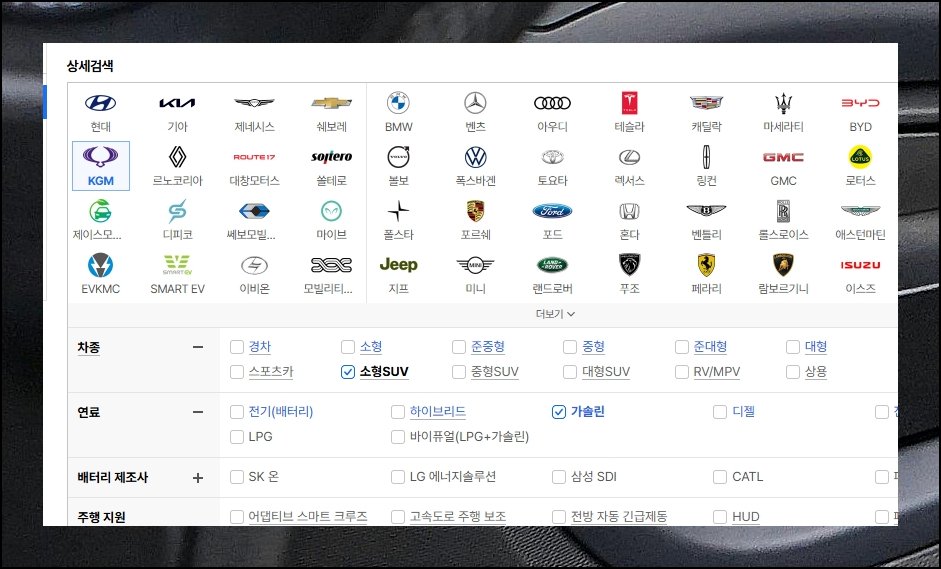 쌍용자동차 라인업 중 관심 가는 차가 정해져 있다면 필터를 걸어 찾으면 돼요. 최근 주목받는 소형 SUV를 골라 시범 조회해 보겠습니다. 전 모델을 훑어보고 싶으신 분은 필터 없이 곧바로 탐색하세요.