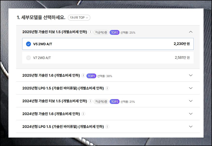 쌍용자동차 티볼리 에어를 사례 삼아 신차가격표의 세부 출고가를 살펴볼게요. 금액 영역에 표기된 기본 적용 탭을 클릭하세요. 트림별로 나뉜 상세 단가표가 곧바로 모니터에 펼쳐집니다.