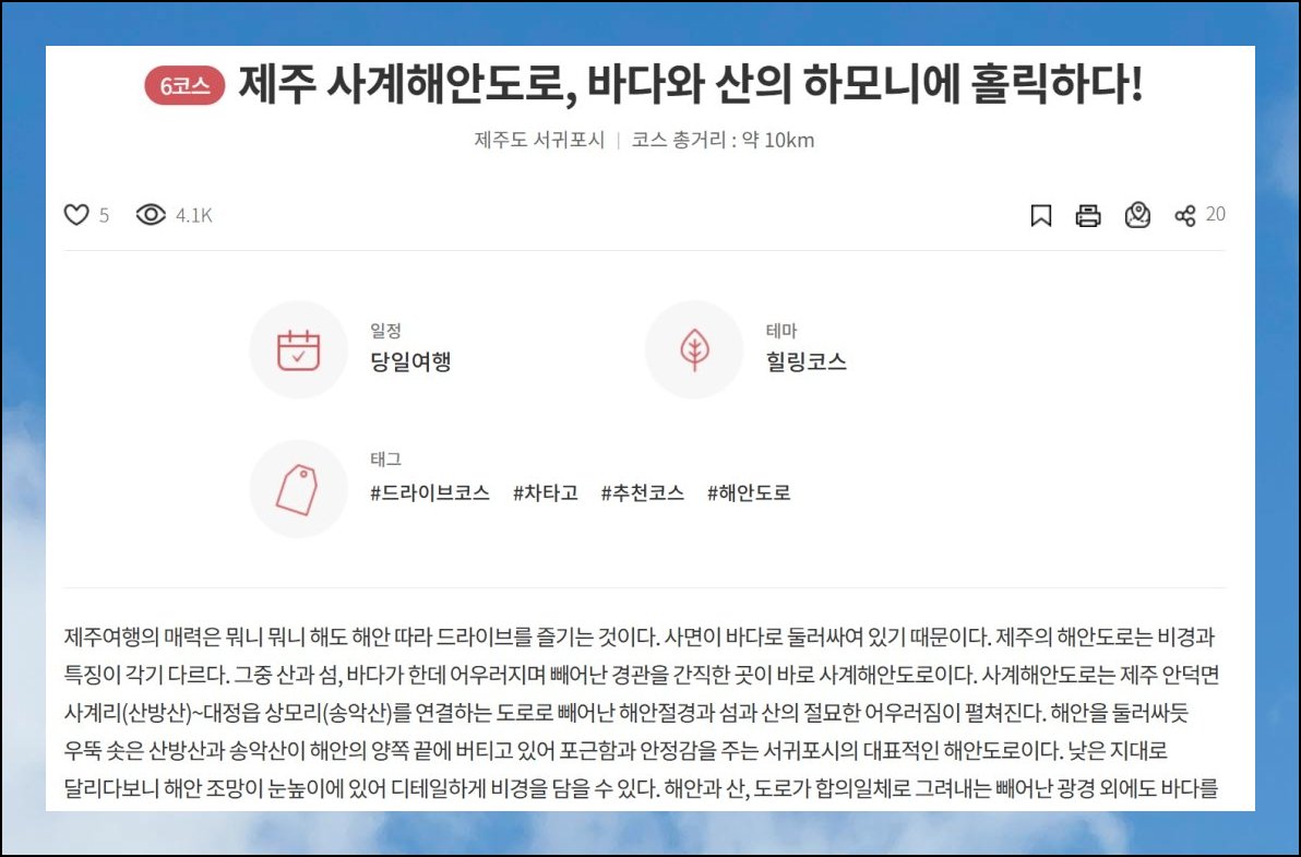 이 플랫폼은 정부 산하 조직이 직접 꾸려가고 있어요. 덕분에 올라온 내용의 정밀도가 남다릅니다. 제주처럼 사람들이 몰리는 핫스폿뿐 아니라 아직 덜 알려진 포인트까지 빠짐없이 담겨 있어요.