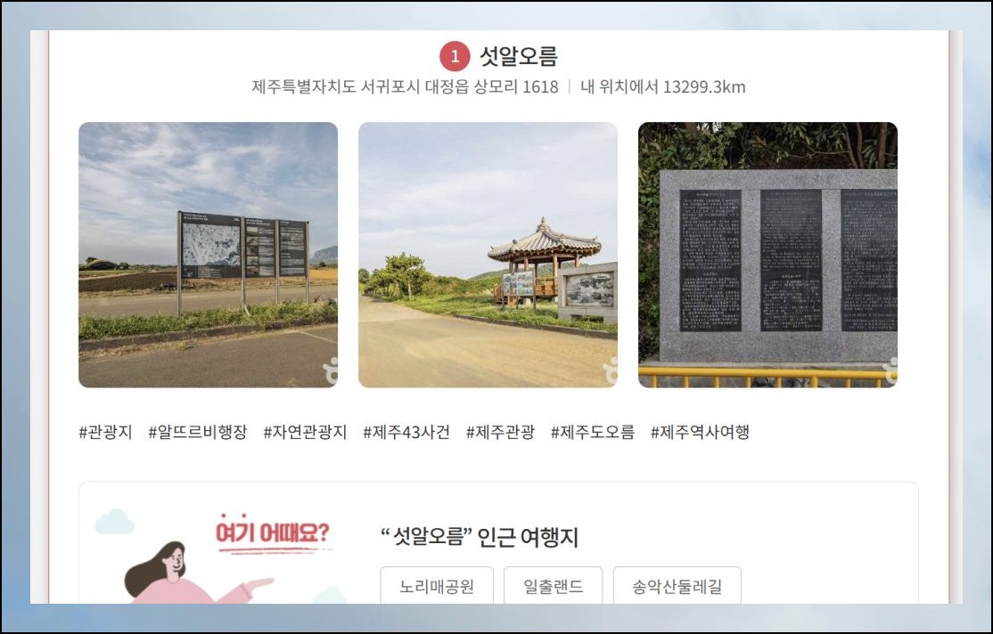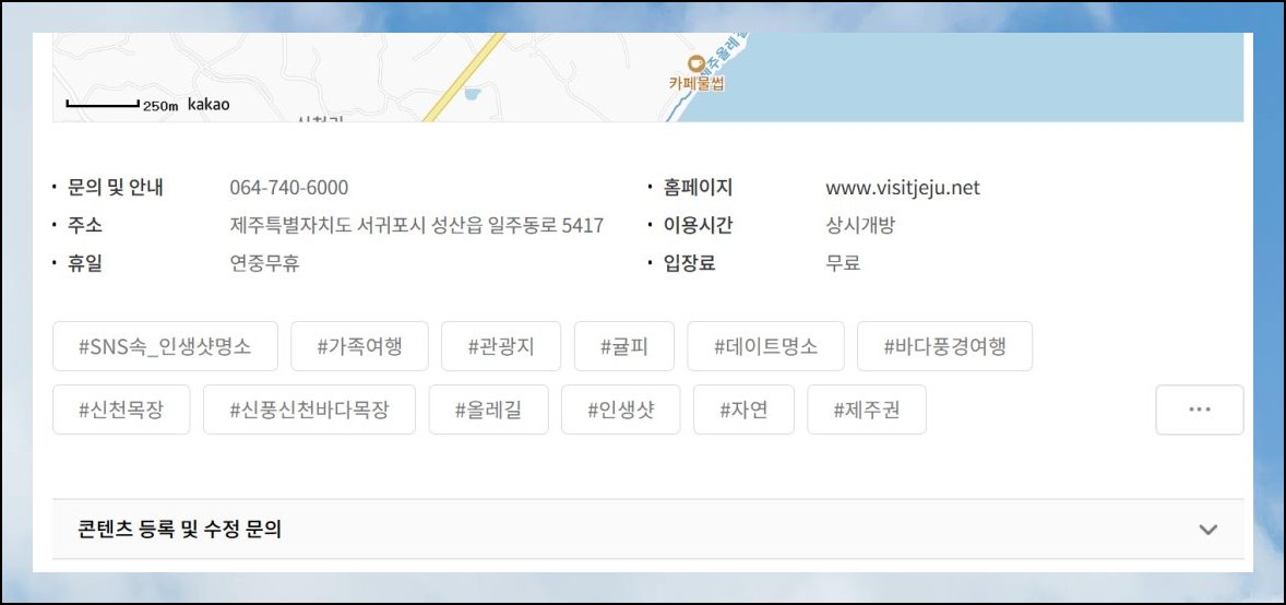 천 건을 훌쩍 넘기는 방대한 데이터가 펼쳐져 있습니다. 태그 필터를 걸면 조건에 부합하는 곳만 추려볼 수 있어요. 2박 3일 일정 속에 성산일출봉 같은 상징적 명소를 끼워 넣어 보길 추천합니다.