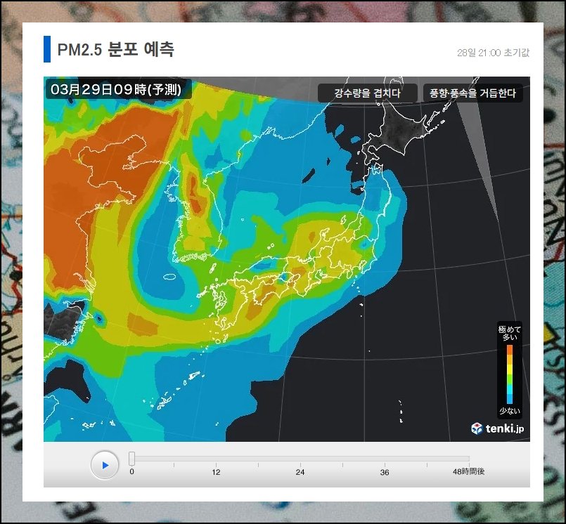 네이버 위성지도 검색 기능만으로는 대기 오염 수준을 알아내기가 쉽지 않습니다. 그 빈자리를 채워주는 곳이 일본 TENKI 웹페이지예요. 한반도 대기질 동향을 시시각각 모니터링할 수 있거든요. 주기적으로 데이터가 새로 올라오기 때문에 정확도 측면에서도 믿을 만합니다. 일본어가 걸린다면 웹 브라우저의 자동 통역 기능을 켜보세요.