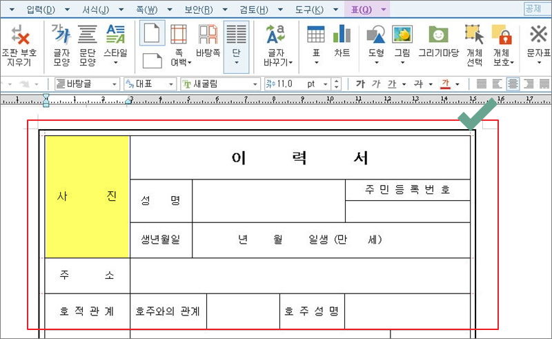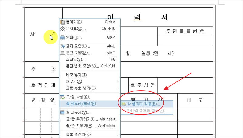 ▼ 이력서 양식에 보면 사진을 넣는 부분이 있습니다. 여기에 딱 맞게 사진을 넣는 방법을 알려드리겠습니다. 생각보다 간단합니다. 일단 사진 항목에 마우스 우클릭을 합니다. 그럼 여러 가지 메뉴가 커서 옆에 나타나는데요. 여기에서 "셀 테두리/배경"의 하위 메뉴인 "각 셀마다 적용"을 클릭합니다.