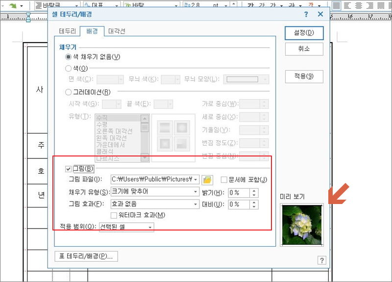 ▼ "셀 테두리/배경" 창이 열렸습니다. 여기에서 "배경" 탭을 선택합니다. 그럼 선택을 통해 색, 그라데이션, 그림을 채워 넣을 수 있습니다. 여기서 그림을 선택한 후 그림 파일을 알바 이력서에 넣을 사진 파일로 선택하면 됩니다. 채우기 유형은 크기에 맞추고, 그림 효과는 없는 것으로 선택합니다. 미리 보기 화면을 통해 알바 이력서 양식에 있는 사진 항목에 쏙 들어갔는지 확인하면 됩니다.