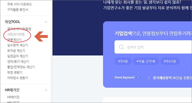 ▼ 기업연구소 페이지에서는 여러 가지 취업에 관련된 서비스나 TOOL을 제공하고 있습니다. 알바 지원을 할 때 자기소개서를 작성해야 하는 경우에는 좌측에 있는 메뉴에 보이는 "글자수세기/맞춤법" 서비스를 이용하면 좋습니다. 급여가 제대로 들어왔는지 확인하려면 "실수령액 계산기"를 이용하면 되죠. 이력서에 넣을 사진의 크기를 조절하려면 좌측에 있는 메뉴에서 "사진크기조정" 서비스를 이용하면 됩니다.