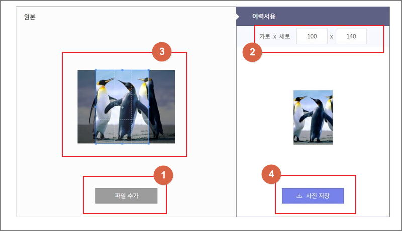 ▼ 해당 사이트에서 제공하는 사진 크기 조정 서비스를 이용하는 방법은 어렵지 않습니다. 일단 파일 추가 버튼을 클릭한 후 크기를 조절할 이미지 파일을 불러옵니다. 이 상태에서 우측에 있는 이력서용 영역에서 가로와 세로의 길이를 입력합니다. 다시 좌측에 있는 원본 영역에서 나타내고자 하는 영역을 맞추어 줍니다. 다 맞추었으면 "사진 저장" 버튼을 눌러 컴퓨터에 저장하면 됩니다.