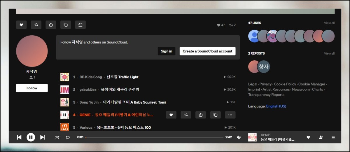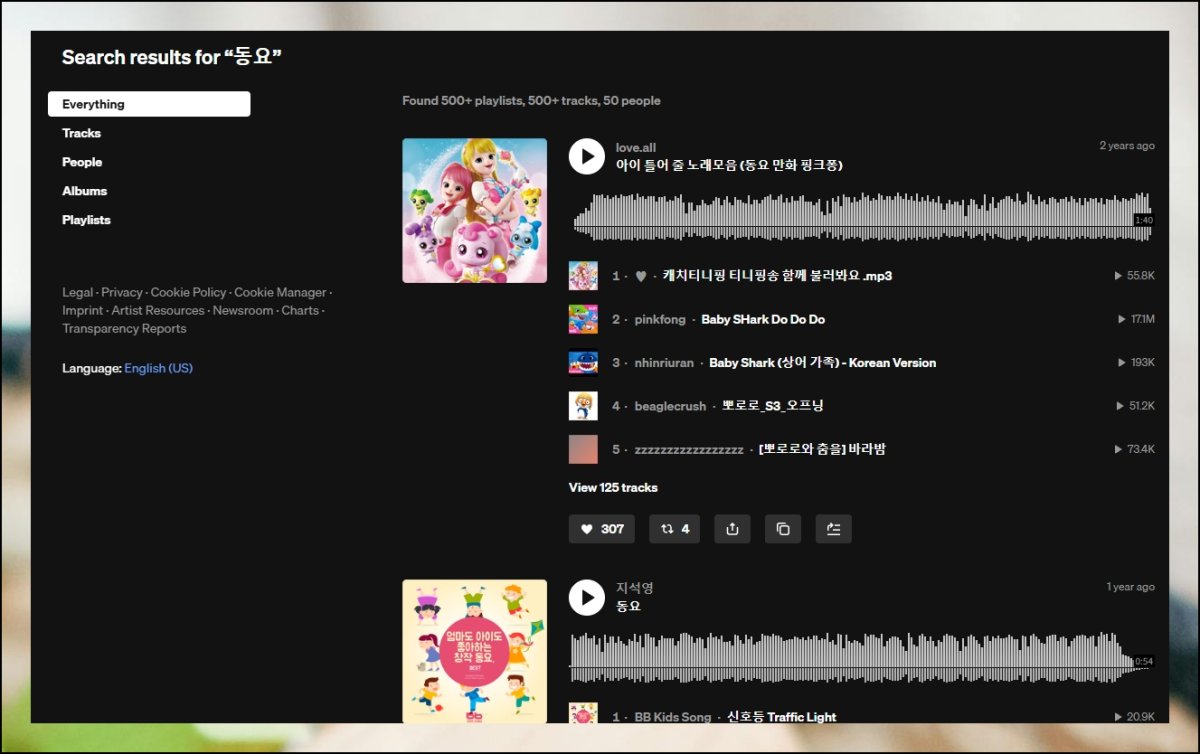 조회하면 돈 들이지 않고 연속듣기 가능한 항목이 500건을 가볍게 넘깁니다. 어린이가 좋아하는 동요 멜로디로 묶인 모음집도 다수 포함되어 있어요. 좌측의 TRACKS 탭을 선택해 보세요. 음원 위주로 깔끔하게 배열된 리스트를 바로 확인할 수 있습니다.