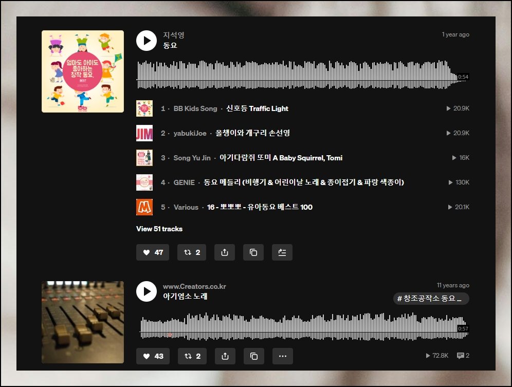 평소 제가 애용하는 소리 중심의 서비스를 하나 공유해 드리려고 해요. 한국에서는 아는 분이 드문 편인데, 어린이 동요를 끊김 없이 연속듣기할 수 있는 꽤 유용한 사이트입니다. 분량도 자유롭게 조절 가능해요. 짧은 건 수 분 단위이고 긴 건 서너 시간짜리도 있습니다. 전 세계 사람들이 올린 음원을 편하게 감상하기 좋은 열린 공간이에요.