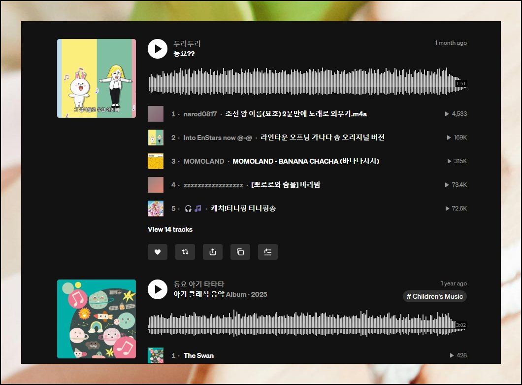 직접 곡을 하나하나 검색하지 않아도 어린이에게 맞는 곡이 자동으로 흘러나오거든요. 한국 전래곡부터 영어권 동요, 클래식풍 자장가까지 장르도 다양하게 갖춰져 있습니다. 연속듣기 설정만 해두면 부모님은 그 사이 다른 집안일을 처리하기에도 수월해요. 오늘 소개해 드리는 방법으로 어린이를 위한 음악 환경을 간편하게 만들어 보세요.