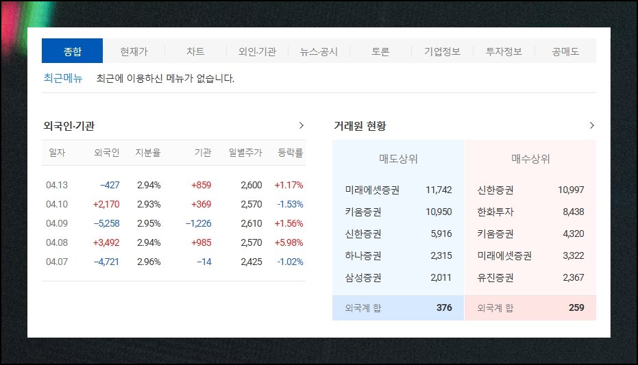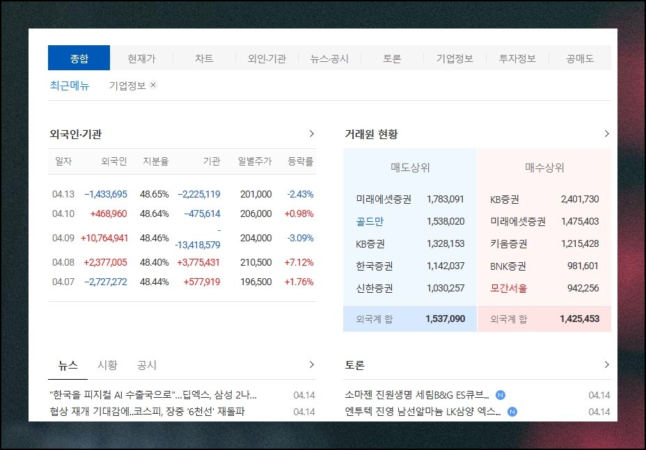 다음증권 웹페이지를 열면 모든 종목의 주식시세 조회와 기업 리서치를 무료로 이용할 수 있어요. 그래프나 뉴스는 물론이고 기관과 외국인의 실시간 매매 흐름도 확인됩니다. 투자 초심자라도 직관적으로 파악할 수 있게 화면이 잘 구성되어 있어요.