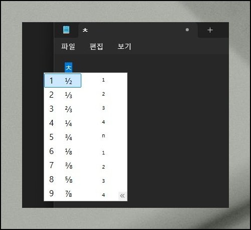 "치읏"키와 한자키를 함께 쓰면 특수기호로 분수를 또렷하게 나타낼 수 있어요. 수학 풀이나 음식 조리법을 정리할 때 비율을 분명하게 보여주기에 적합합니다. 평범했던 보고서에 전문적인 분위기까지 더해줘요. 손으로 그릴 필요 없이 단정한 분수가 만들어집니다.