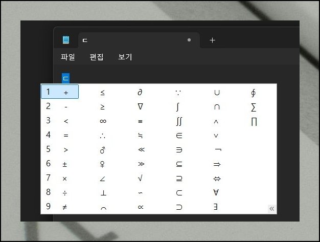 "디귿"키를 누르면 수식 작성에 요긴한 여러 기호가 펼쳐져요. 단순한 사칙연산 부호는 물론 어려운 산식에 들어가는 기호까지 알차게 마련돼 있어요. 자판에서 직접 못 치는 특수기호도 어렵지 않게 찾아 쓸 수 있습니다. 수학 자료를 다루는 과정이 한결 매끄러워져요.