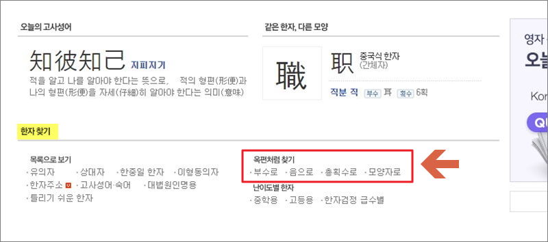 ▼ 네이버 한자사전 사이트에 접속했습니다. 메인 페이지에서 화면을 아래로 내려봅니다. 그럼 한자 찾기 서비스가 여러 개 나타납니다. 이 중에서 옥편 한문찾기 방식은 4가지가 있습니다. 부수, 음, 총획수, 모양자를 이용하는 방식이죠.