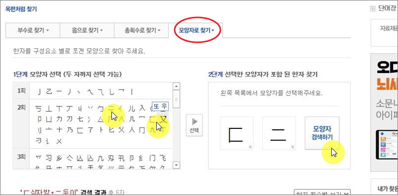 ▼ 2개의 모양자를 선택한 후 "모양자 검색하기" 버튼을 클릭합니다. 그럼 해당하는 한자를 만나볼 수 있습니다.