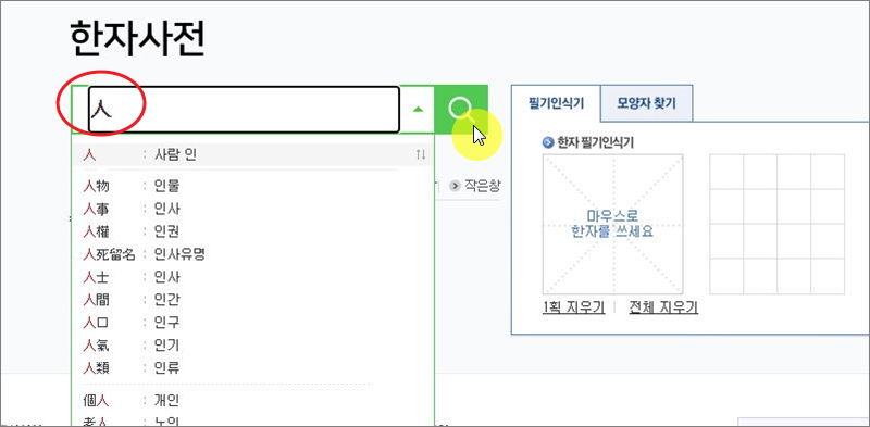 ▼ 제가 인터넷 옥편 서비스에서 추천하는 것은 한자 필기인식기를 사용하는 방식입니다. 문자를 보이는 그대로 그려 넣기만 하면 됩니다.