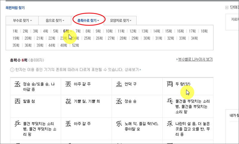 ▼ 총획수로 한문찾기 방법은 옥편 사용법 중에서 쉬운 방법에 속합니다. 한자에 대한 획수를 하나씩 세어본 후 총 획수를 선택하면 됩니다. 그럼 인터넷 옥편에 저장되어 있는 한자 중에서 해당 획수에 속하는 것만 나타나는데요. 여기서 찾고자 한 문자를 클릭하면 사전 정보를 확인할 수 있습니다.