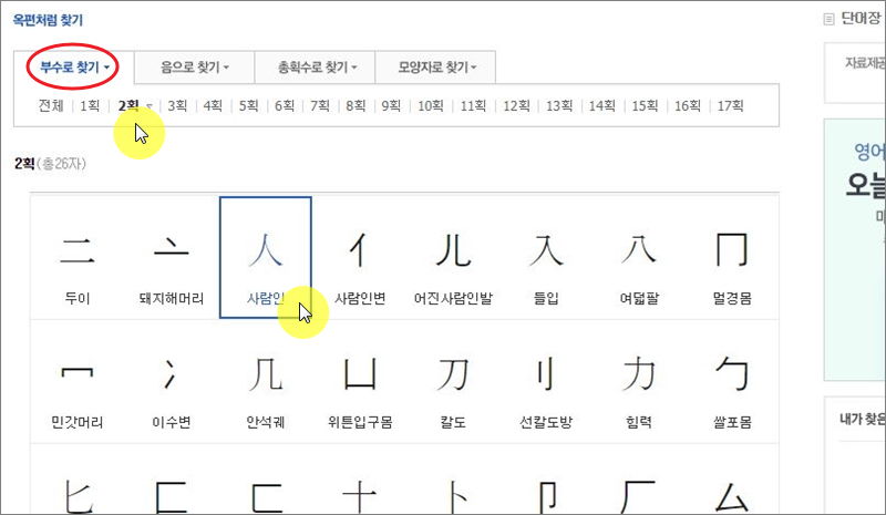 ▼ 찾고자 하는 한자의 부수를 알고 있는 경우에는 "부수로 찾기" 방식을 사용하면 됩니다. 한문에 대한 지식이 많아야 부수를 알 수 있기 때문에 옥편 사용법 중에서도 난이도가 있는 방식입니다.