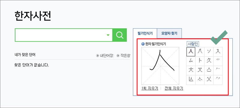 ▼ 필기인식기를 이용한 한문찾기 결과를 검색해 볼 수 있습니다. 단어와 고사성서도 검색이 가능하니 참고 바랍니다.