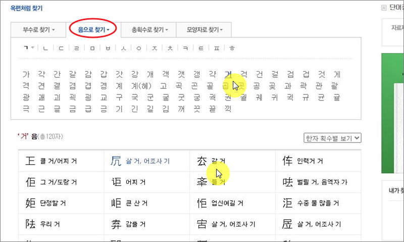 ▼ 한자의 음을 알고 있는 경우라면 음으로 한문찾기 가능합니다. 한글로 된 음을 클릭하면 해당 음을 가진 한자 목록이 모두 나타납니다. 너무 많은 한문이 나오는 경우에는 리스트 우측 상단에 있는 "한자 획수별 보기"를 사용하면 됩니다.