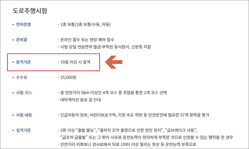 ▼ 도로주행시험의 경우에도 정해진 합격 점수가 있습니다. 70점 이상 취득을해야 합격인데요. 도로주행시험도 수수료가 만만치 않기 때문에 한 번에 합격하는 것이 중요합니다. 적어도 실격을 하지 않는 것이 중요한데요. 실격 처리가 되면 점수와 상관 없이 탈락이기 때문입니다.