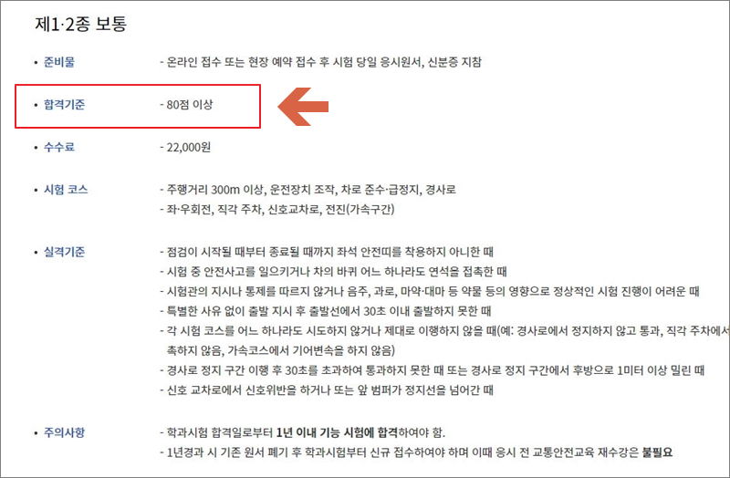 ▼ 다음은 운전면허 2종 실기(기능) 시험에 대한 합격 점수를 알려드리겠습니다. 운전면허 1종과 2종 모두 80점 이상 취득하면 합격입니다. 수수료가 필기 시험보다 비싸기 때문에 시험준비를 철저히 하여 한 번에 합격하는 것이 중요합니다.