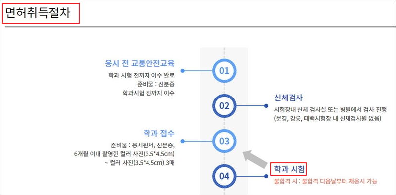 ▼ 이번에는 운전면허 2종 취득 절차를 알려드리겠습니다. 가장 먼저 해야 할 것은 필기 시험에 응시하기 전에 교통안전교육을 받는 것입니다. 신분증을 가지고 가야 이수할 수 있습니다. 그다음 신체검사를 받으면 필기 시험을 볼 수 있습니다. 필기시험의 경우 불합격을 한 다음날에도 재응시가 가능하오니 참고해 주시길 바랍니다.