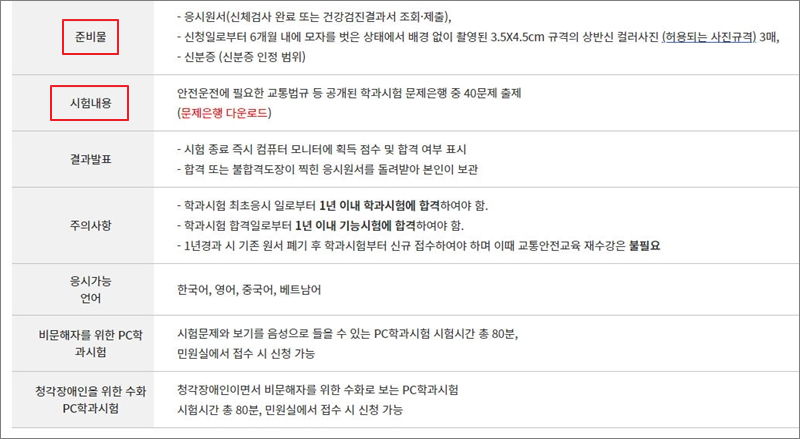 ▼ 준비물은 응시원서, 신분증, 사진 3매가 있고, 시험 내용의 경우 공개된 필기시험 문제은행에서 40문제가 출제됩니다. 그렇기 때문에 도로교통공단 사이트에서 다운 받을 수 있는 문제은행 자료를 잘 활용하는 것이 중요합니다. 굳이 문제집을 따로 사지 않고, 해당 자료만으로도 충분히 합격 점수에 도달할 수 있습니다.