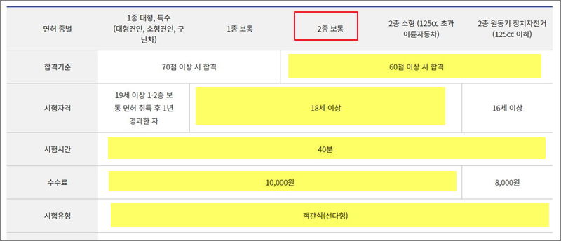 ▼ 시험에 관한 사향은 언제든 변경이 될 수 있습니다. 그렇기 때문에 운전면허 시험을 주관하는 도로교통공단의 홈페이지를 통해 정확한 정보를 살펴보도록 하겠습니다. 일단 운전면허 2종 보통을 살펴보면 합격 점수는 60점 입니다. 필기 시험시간은 40분이고, 객관식으로 되어 있습니다.