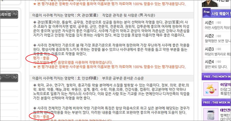 일단 이름이 사주에 끼치는 영향력을 살펴보겠습니다. 재성, 관성, 인성에 대해 나타나는데요. 각각 재물운, 경영운, 직업운, 관직운, 부모운, 공부운 등을 의미합니다. 길게 적혀 있는 풀이를 일일이 읽어보는 것도 좋지만, 시간적으로 여유가 없는 분들은 주황색으로 된 부분만 읽으면 됩니다. 평가 부분을 보면 자신이 갖고 있는 한자 이름이 사주에 좋은 영향을 끼치는지 간단하게 알 수 있습니다.