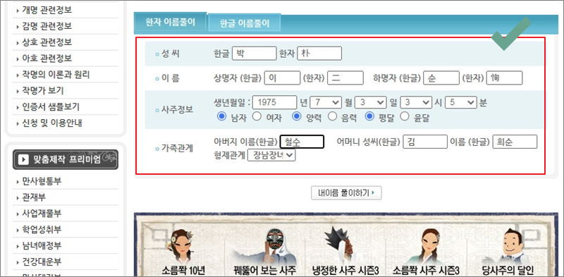 성씨, 이름, 사주정보, 가족관계를 모두 입력했습니다. 부모님의 성씨와 이름까지 한자로 변환할 필요는 없어서 그나마 수월하게 입력했습니다. 해당 정보를 모두 입력했으면 [내이름 풀이하기]를 클릭해 주세요.