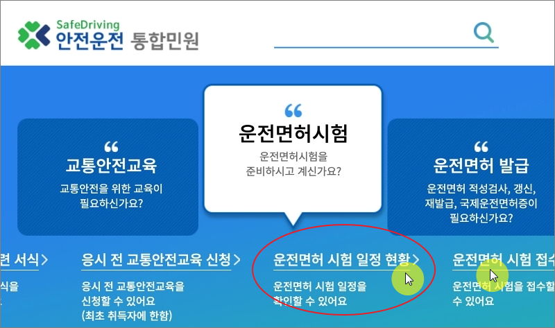 안전운전 통합민원 사이트를 통해 무료로 다운 받을 수 있는 필기 문제 자료를 찾아보겠습니다. 일단 메인화면에서 [운전면허시험]과 [시험 일정 현황]을 차례대로 클릭해 주세요.
