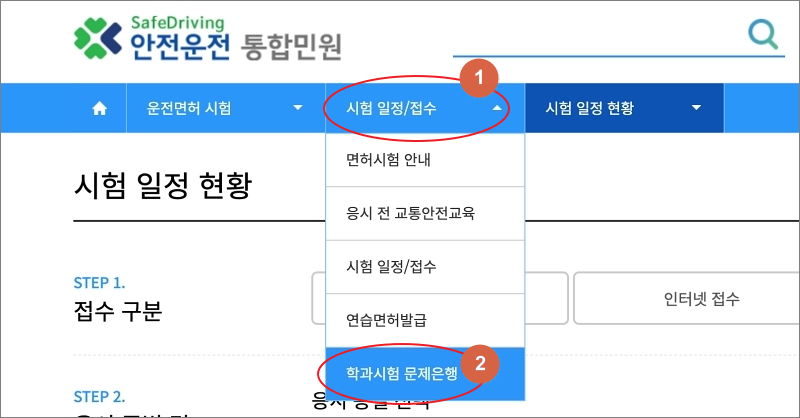 시험 일정 현황 페이지에 접속하면 화면 상단에 있는 메뉴에서 [시험 일정/접수]를 클릭해 봅니다. 그럼 면허시험 안내, 응시 전 교통안전교육, 연습면허발급 등 여러 메뉴가 나타나는데요. 가장 아래에 있는 학과시험 문제은행을 클릭하면 필기 문제 자료를 다운 받을 수 있는 페이지가 열립니다.