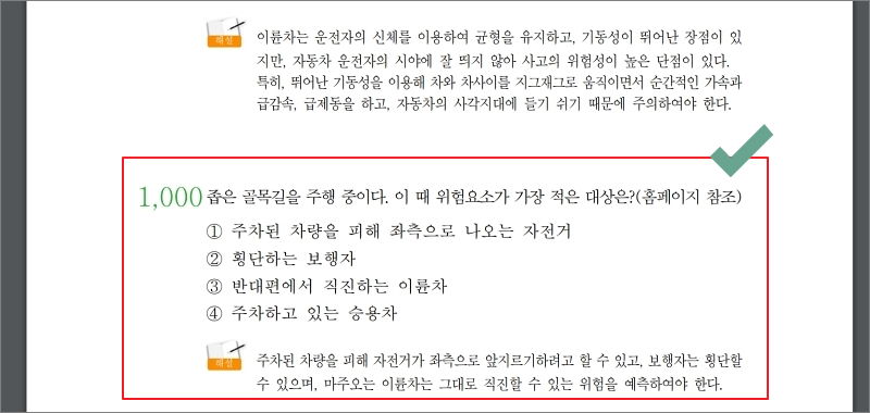 문제은행 자료는 총 1000개의 문제로 구성이 되어 있습니다. 직접 필기 문제를 풀어보면 아시겠지만, 상세한 해설과 답도 포함이 되어 있습니다. 해석 덕분에 해당 자료만 가지고도 쉽게 운전면허 필기시험을 준비할 수 있습니다. 물론 자동차나 교통에 관한 지식이 많지 않은 경우에는 기본서를 한 번 읽어보는 것이 좋습니다.