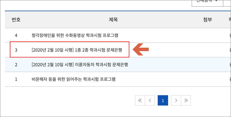 이곳에서 우리가 다운 받아 사용할 수 있는 필기 시험 문제는 4가지가 있습니다. 게시물 1번은 비문해자 등을 위한 필기시험 프로그램이고, 4번은 청각장애인을 위한 프로그램입니다. 2번의 경우 이륜자동차 운전면허를 취득하는 경우에 선택하면 되고, 대부분은 3번 1종 2종 학과시험 문제은행을 이용하면 됩니다.