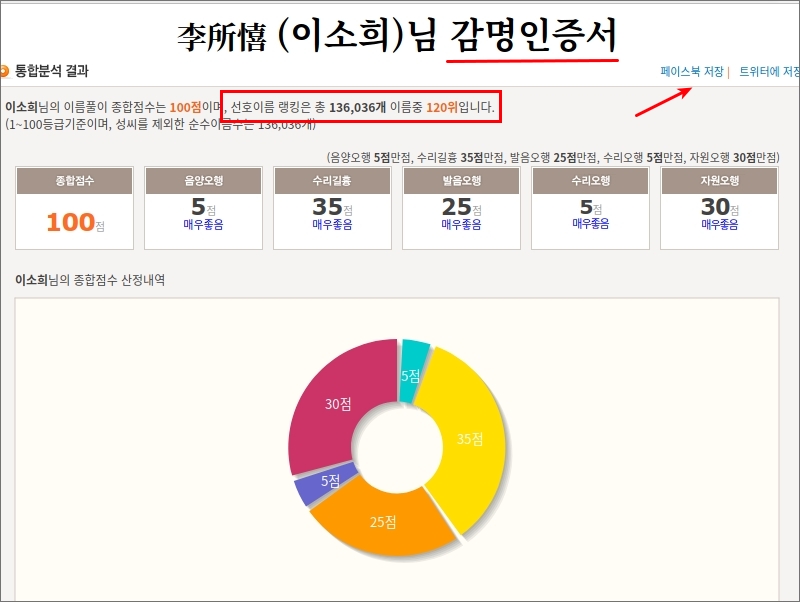 감명인증서 페이지가 열렸는데요. 이를 통해 우리가 선택한 성명에 대한 종합점수, 선호이름 랭킹을 확인할 수 있어요. 페이스북이나 트위터에 저장도 가능하오니 저장을 하고, 필요할 때 사용하시면 좋을 것 같아요.