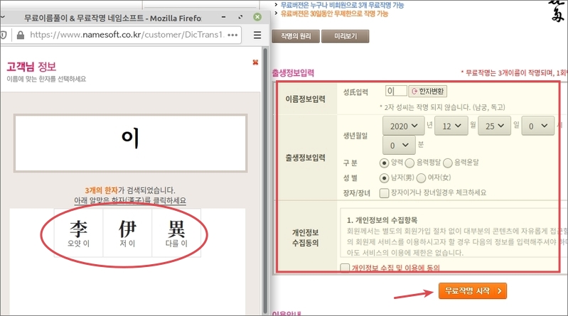 해당 서비스를 이용하기 위해 가장 먼저 해야 할 것은 출생정보를 입력하는 일에요. 일단 성 씨를 입력해야 하는데요. 한글로 입력한 후, "한자변환" 버튼을 클릭하면 쉽게 변환이 가능해요. 그 다음으로는 아이가 태어날 날 또는 태어난 날짜를 입력해 주세요. 성별은 여자를 선택하면 돼고요. 여자 아이가 혹시 장녀라면 "장자/장녀" 체크박스에 체크해 주셔야 해요. 모두 입력했으면 "무료작명 시작" 버튼을 클릭해 주세요.