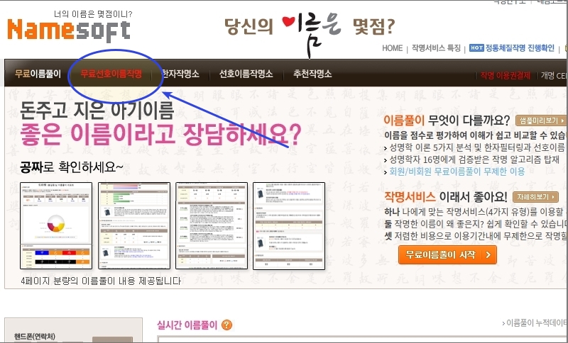 네임소프트 사이트에 접속했어요. 메뉴에서 "무료 선호이름 작명"을 클릭해 주세요. 참고로 이곳에서는 단순히 이쁜 한글이름을 추천해주는 것이 아니에요. 성명학에 기반하여 인생 전반적으로 좋은 영향을 주는 이름을 추천해 주지요. 물론 300개의 한글 이름 중에서 마음에 드는 것을 선택할 수 있으니 거기서 예쁜 성명을 고르면 돼요.