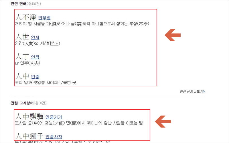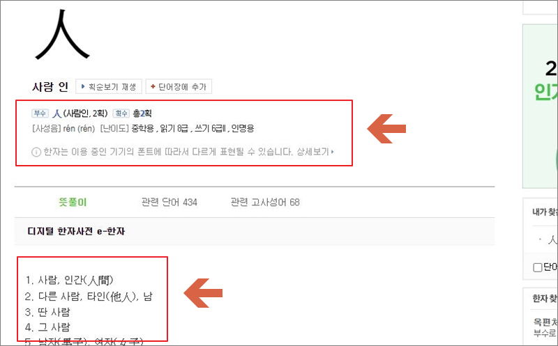 저는 그냥 "사람 인"이라는 한문에 대해 알아보려고 해요. 부수나 획수, 난이도는 물론이고, 인명용으로 사용할 수 있는 한문인지도 알아볼 수 있어요. 뜻풀이를 보시면 생각보다 많은 뜻을 갖고 있음을 알 수 있어요. 번역기를 통해 얻은 뜻을 가지고 이해하면 돼요.