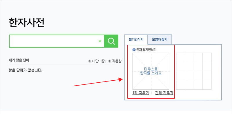 우리가 찾던 한문 번역기 서비스가 나타났어요. 다양한 방법을 통해 모르는 한자에 대한 번역이 가능한데요. 제가 가장 추천하는 방식은 한자 필기인식기를 이용하는 것이에요. 마우스로 한자의 모양을 그리기만 하면 되기 때문에 정말 편해요.