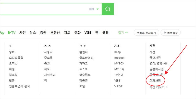 새롭게 열린 여러 메뉴 중에서 가장 우측을 보면 사전 카테고리가 있는데요. 여기에서 한자사전을 클릭해 주세요.