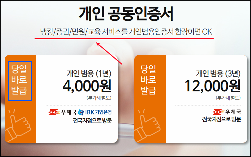 많은 사람들이 발급 받는 개인을 기준으로 방법을 설명해 드릴게요. 사업자용도 발급 방법은 거의 차이가 없어요. 앞서 언급한 바와 같이 범용공동인증서 하나면 뱅킹, 증권, 민권, 교육 등 대부분의 서비스를 이용할 수 있어요. 1년에 부가세 별도로 4000원이라는 비용이 들지만, 온라인 업무를 많이 한다면 아깝지 않은 정도에요. 해당 홈페이지에서 표시가 되어 있듯이 당일 바로 발급이 가능해요.