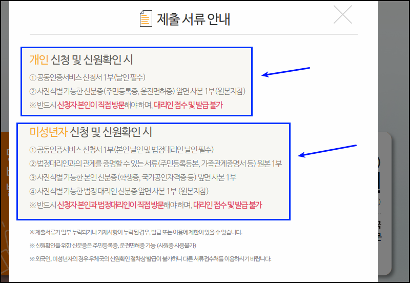 방금 작성한 신청서를 출력하여 신분증 앞면사본을 가지고 서류제출기관을 방문하면 되는데요. 대리인 접수 및 발급은 불가하고요. 미성년자의 범용공동인증서에 대한 발급 신청을 하는 경우에는 제출해야 하는 서류가 좀 더 많아요. 대리인에 관한 서류인데요. 해당 부분도 꼼꼼히 챙겨주세요.