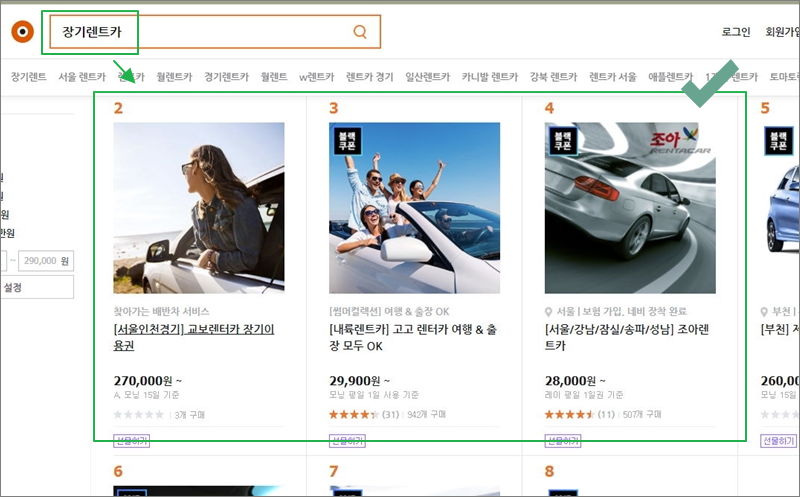 티몬 홈페이지에 접속했어요. 화면 상단에 보면 검색창이 있는데요. 여기에 장기렌트 차량을 검색해 보세요. 그럼 여러 곳이 나오는데요. 여러 판매 정보 중에서 차량을 이용할 지역에 맞는 곳을 선택해 보세요. 검색 결과에 나온 가격은 최저 조건에 대한 비용이기 때문에 클릭해야 정확한 장기렌트 비용을 확인 및 비교할 수 있어요.