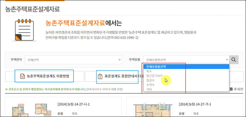 농가주택을 지으려고 할 때 마음대로 짓는 것이 아닙니다. 어느 정도 농어촌 자연경관과 조화를 이루어야 하는데요. 이를 도와줄 표준설계도 자료를 이용하면 큰 도움이 됩니다. 일단 해당 설계 자료를 찾기 위해 농가주택의 유형을 선택해 주세요. 목조, 철골조, 조적조, 목조 등 여러 유형을 선택할 수 있습니다. 참고로 농촌주택 표준설계도 이용방법과 종합안내서가 있으니 깊이 있게 알고 싶은 분들은 꼭 참고해 보시길 바랍니다.