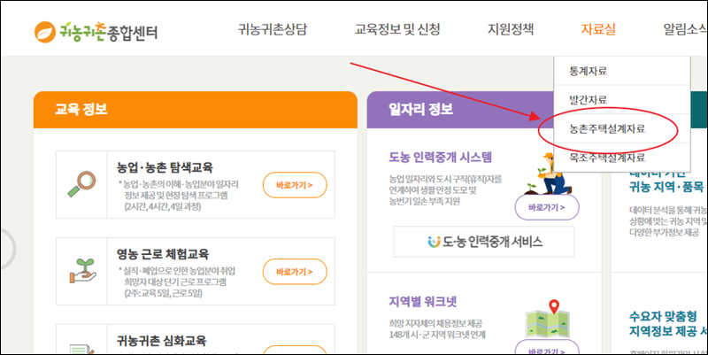 귀농귀촌 종합센터 홈페이지에 접속했습니다. 여러 가지 상담이나 교육, 정책 관련 서비스를 제공하고 있는데요. 농가주택 건출에 필요한 표준설계도를 이용하길 원한다면 메뉴에서 "자료실"을 클릭해 주세요. 그럼 농촌주택 설계자료 서비스 버튼을 찾을 수 있습니다.