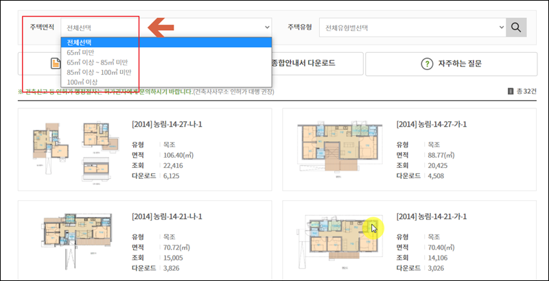 이번에는 농가주택에 대한 면적을 선택할 차례입니다. 65제곱미터 미만에서 100제곡미터 이상까지 다양한 크기로 된 농가주택에 대한 표준설계도 자료를 구할 수 있습니다. 검색 결과에서 마음에 드는 표준설계도 자료를 선택해 주세요.