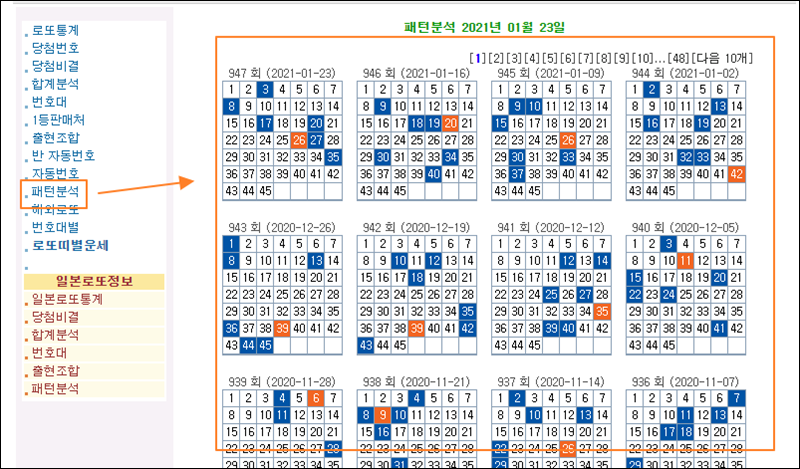 너무 수치적으로만 보면 피곤할 수 있습니다. 느낌을 중요하게 여기는 경우에는 패턴분석 서비스를 이용해 보세요. 시각적으로 어떤 부분의 숫자가 로또 1등에 많이 당첨이 되는지 알아볼 수 있습니다.