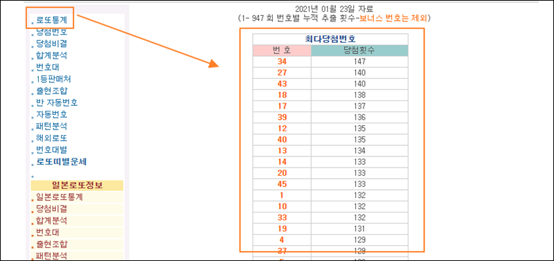 새롭게 열린 페이지에서 좌측에 있는 소메뉴를 봐주세요. 그럼 여러 가지 로또 관련 서비스 버튼이 보일 겁니다. 여기에서 "로또통계"를 클릭해 봅니다. 그럼 1회부터 최근까지 가장 많이 출현한 번호를 알아낼 수 있습니다. 현재까지 1등많이한 숫자는 34번이고, 두 번째로 많이한 수는 27번입니다. 이런 식으로 1등많이한 숫자에서 그렇지 않은 숫자까지 표를 통해 모두 알아볼 수 있습니다.