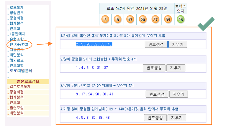 우리가 지금까지 알아본 통계자료를 가지고 반 자동으로 로또 번호를 추천 받을 수 있습니다. 1등많이한 숫자, 2자리 조합출현, 홀짝 통계, 합계범위에 해당하는 숫자를 포함한 추천 번호를 받을 수 있는데요. 추천 받은 숫자가 마음에 들지 않는다면 "번호 생성" 버튼을 계속 누르면 됩니다.